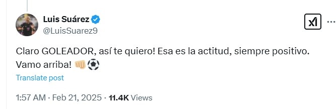 蘇亞雷斯表示道:“你當(dāng)然還是進球的射手,我很愛你!你要永遠(yuǎn)保持積極向上的態(tài)度,繼續(xù)加油吧!??????????”