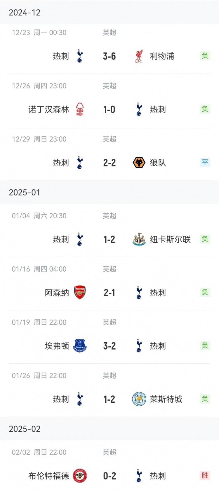 數(shù)據(jù)統(tǒng)計(jì)顯示,熱刺上次在英超贏球還是12月中旬5-0副班長(zhǎng)南安普頓,自那之后他們?cè)庥?平6負(fù)。